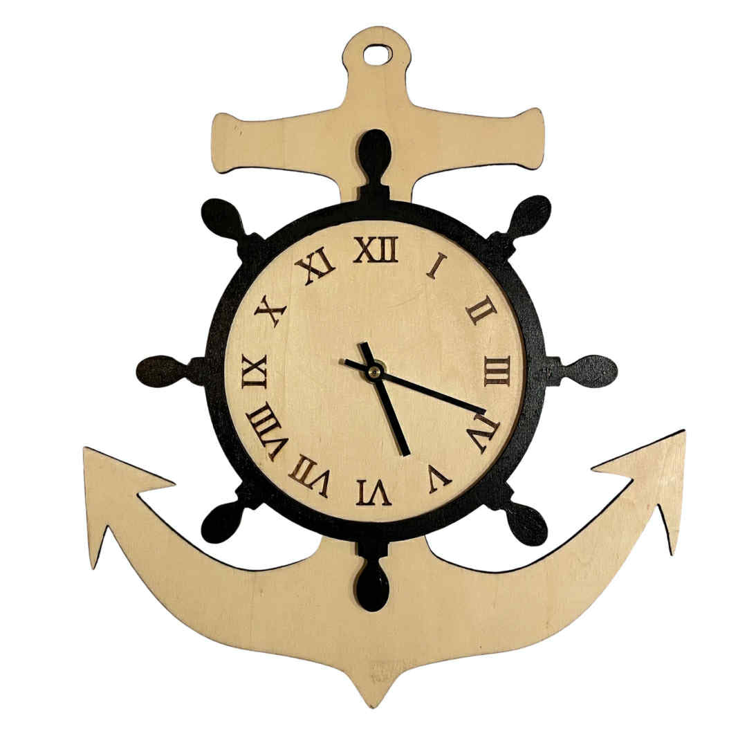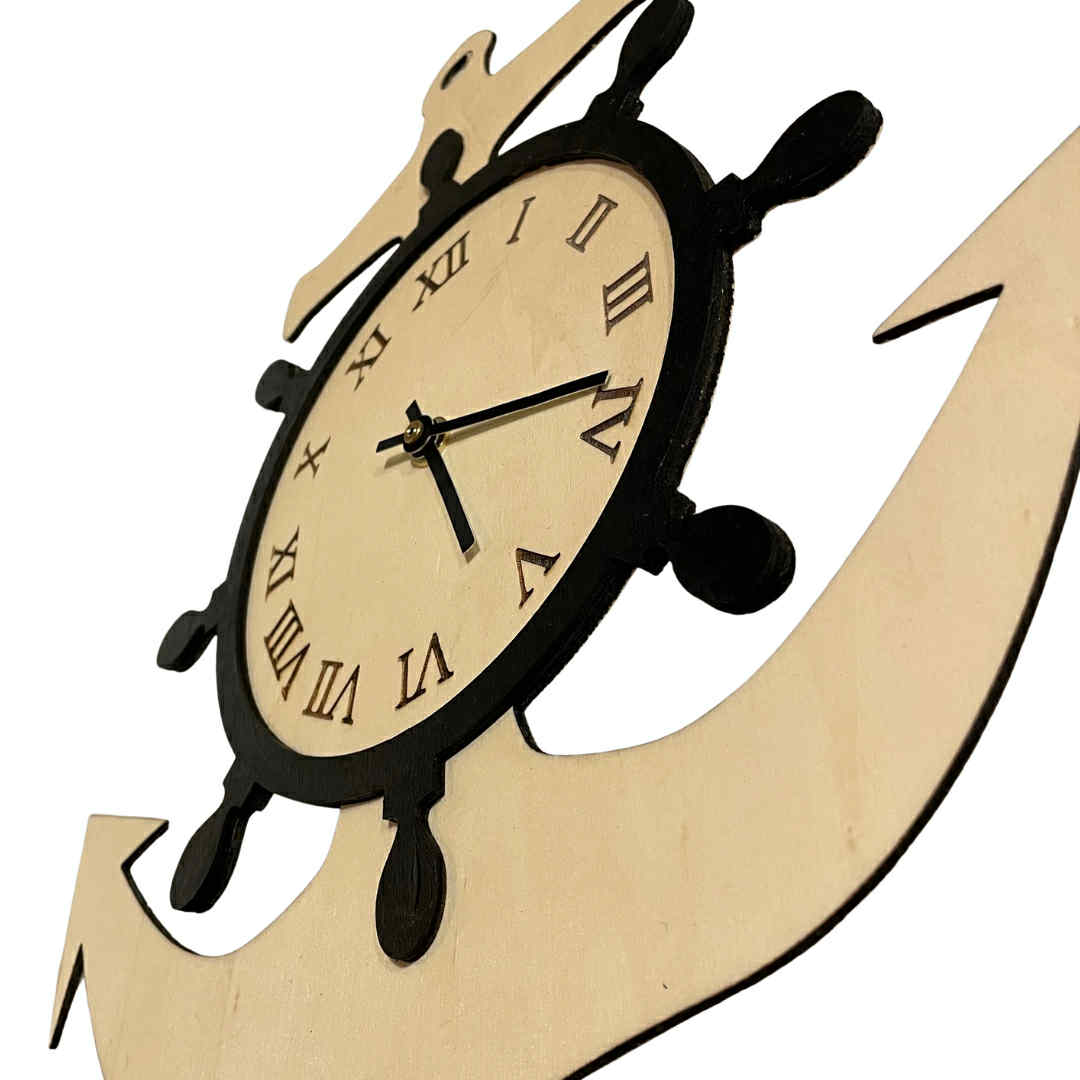 En unik og dekorativ veggklokke med maritimt preg, perfekt for sjøfolk, hyttefolk eller deg som elsker kystlivet. Klokken er formet som et anker med skipsratt rundt urskiven, og er laget i to lag kryssfiner for ekstra dybde og detaljer.