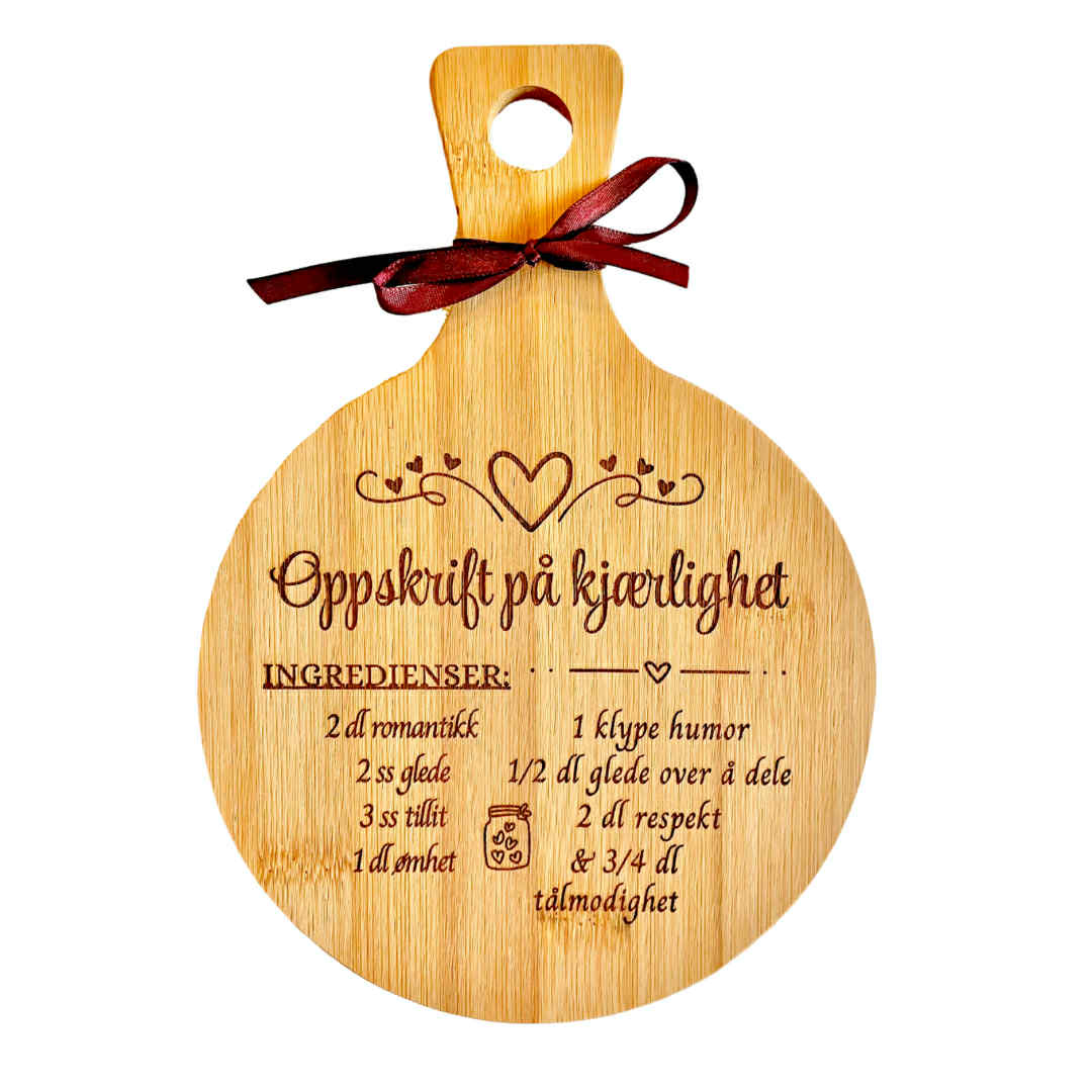 Et romantisk og koselig skjærebrett i bambus, lasergravert med teksten «Oppskrift på kjærlighet». Designet viser en humoristisk og varm oppskrift på hvordan man skaper et godt forhold – perfekt som gave til bryllup, jubileum, innflytting eller bare for å spre litt ekstra kjærlighet på kjøkkenet.