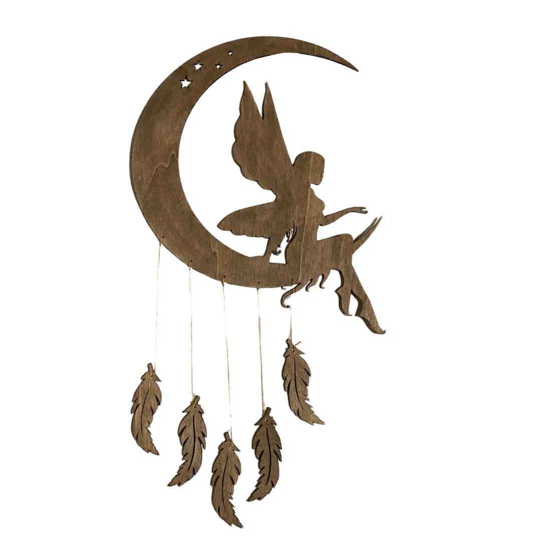 En magisk og dekorativ drømmefanger skåret ut i kryssfiner og beiset med grå beis. Motivet viser en fe som sitter på en halvmåne, omgitt av stjerner. Fem fjær henger ned fra månen, festet med snorer, og gir et lett og svevende uttrykk.