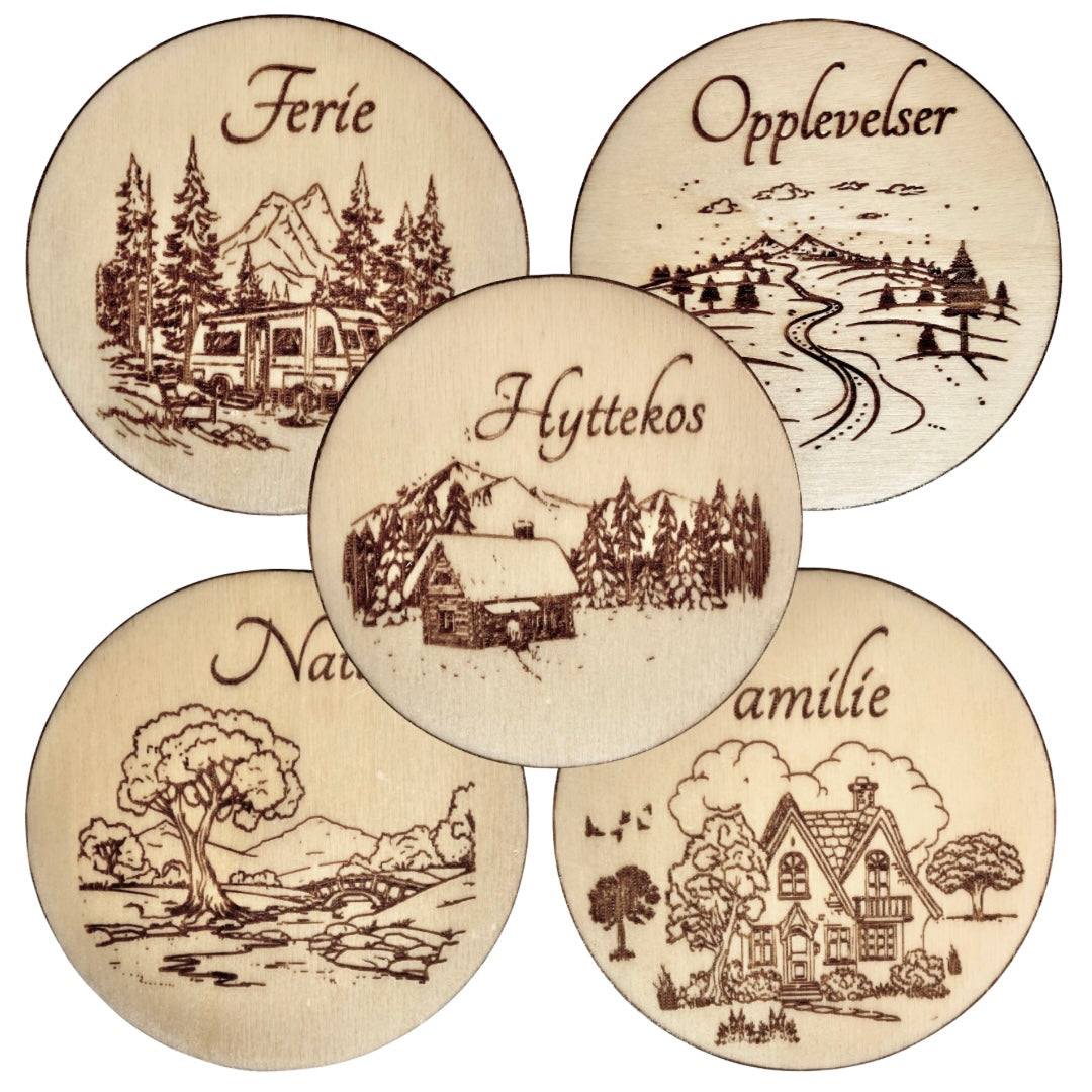 Motivene er laserbrent inn i treverket og viser ulike sider av hytteidyll – natur, familie, ferie og opplevelser. Perfekt som gave, eller som en koselig detalj på hytta, i stua eller ute på terrassen.