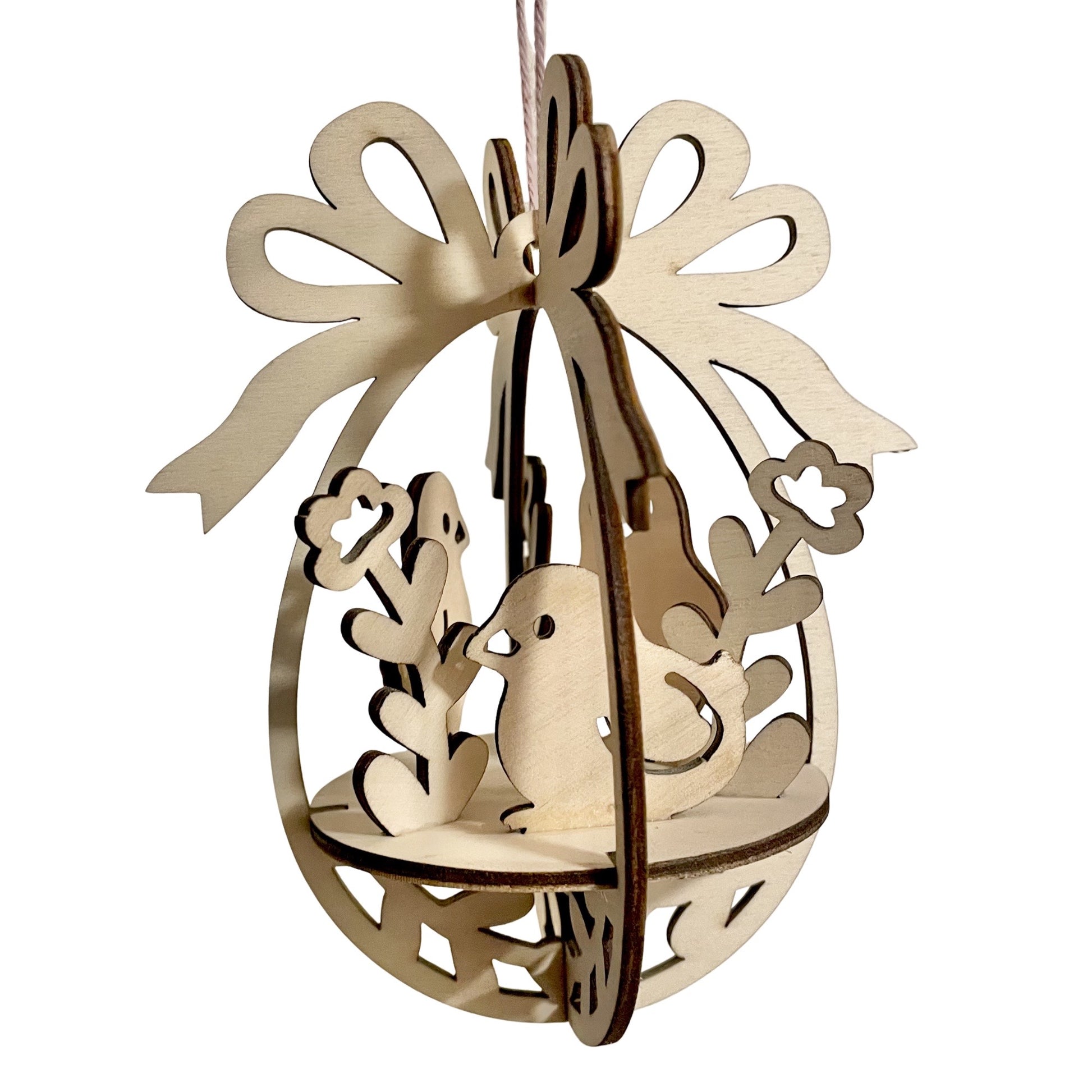 Et sjarmerende og håndlaget påskeegg i tre, perfekt til å henge i vinduet, på en kvist eller som en del av påskepynten. Egget er laserskåret i 3 mm kryssfiner med et detaljert motiv av tre kyllinger, omgitt av blomster og fine utskjæringer som gir et varmt og naturlig uttrykk.
