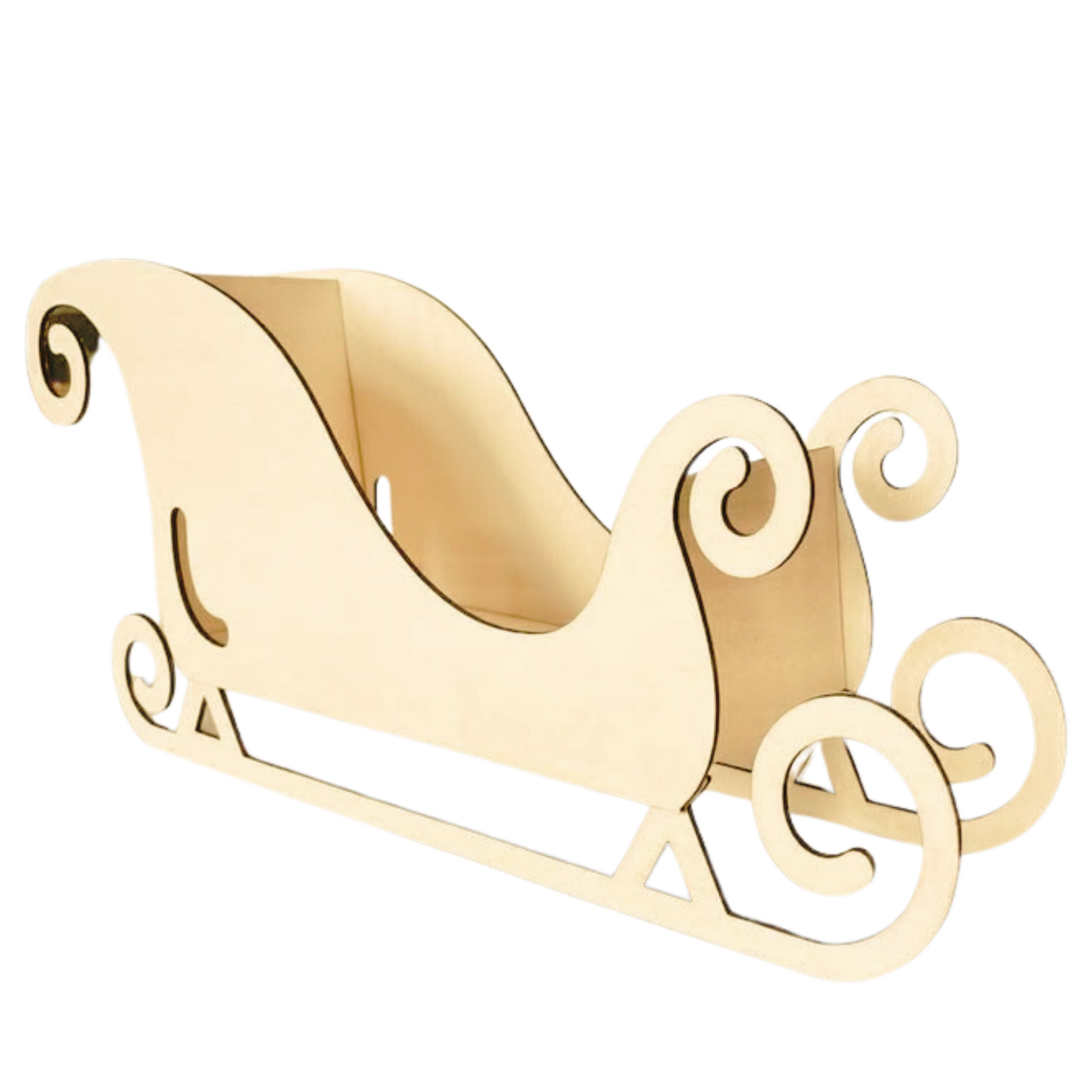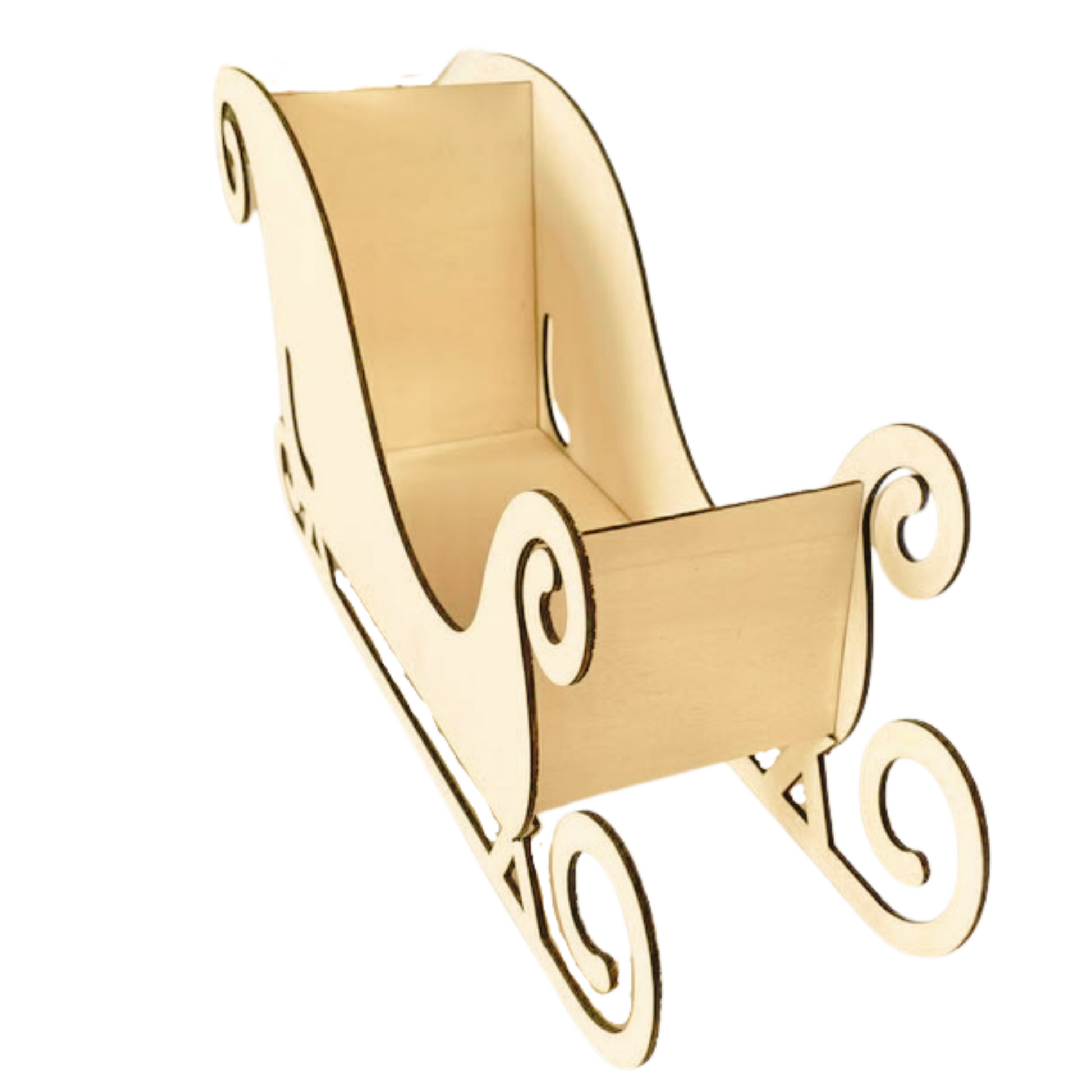 Denne dekorative sleden er laget i lyst kryssfiner og har et tidløst design med buede kanter, elegante krøller og høye ryggstøtter. Den passer perfekt som julepynt – enten alene eller som base for kreative oppsatser med nisser, gaver, granbar eller lys.