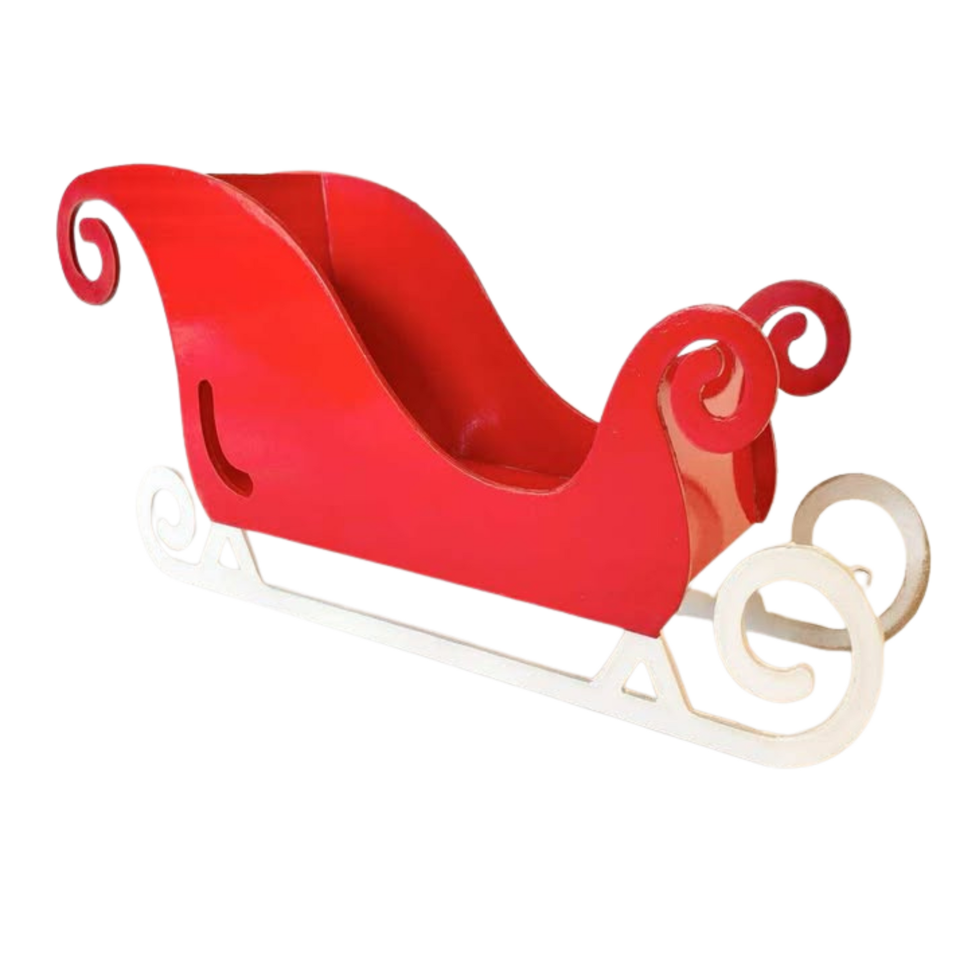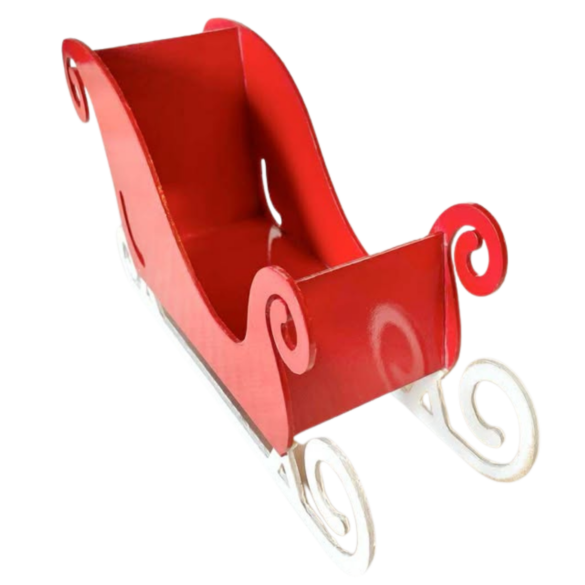 Denne håndlagde sleden i tre er en stemningsfull juledekorasjon med klassisk design og vakre detaljer. Med sin dype rødfarge og hvite spiralmønstrede meier, gir den et nostalgisk og festlig uttrykk som passer perfekt inn i tradisjonell julepynt.