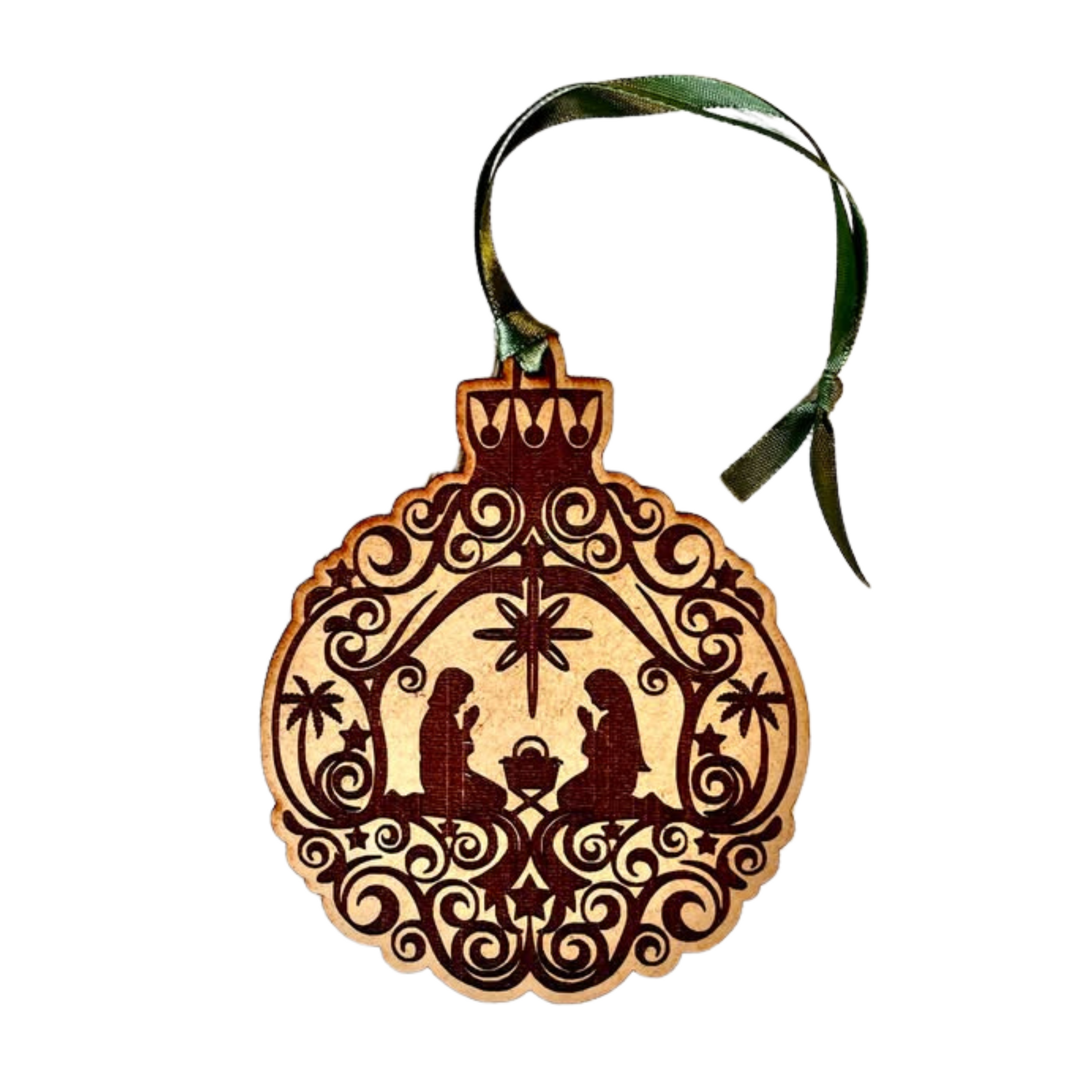 Denne vakre juletrepynten er laget i HDF (High-Density Fiberboard) og har en rund form inspirert av klassiske julekuler. Midt i dekoren finner du et intrikat gravert motiv av julekrybben, med Maria, Josef og Jesusbarnet under en strålende stjerne.