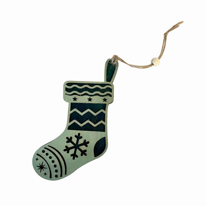 Skap ekte julestemning med disse dekorative strømpene i tre! Hver strømpe er laget i to lag – kryssfiner og HDF – med 3 mm tykkelse, og har fine utskårne detaljer som snøfnugg, stjerner og bølgemønstre. Leveres i tre farger: blå, grønn og natur. Med snor for enkel opphenging på juletreet, peisen eller veggen.