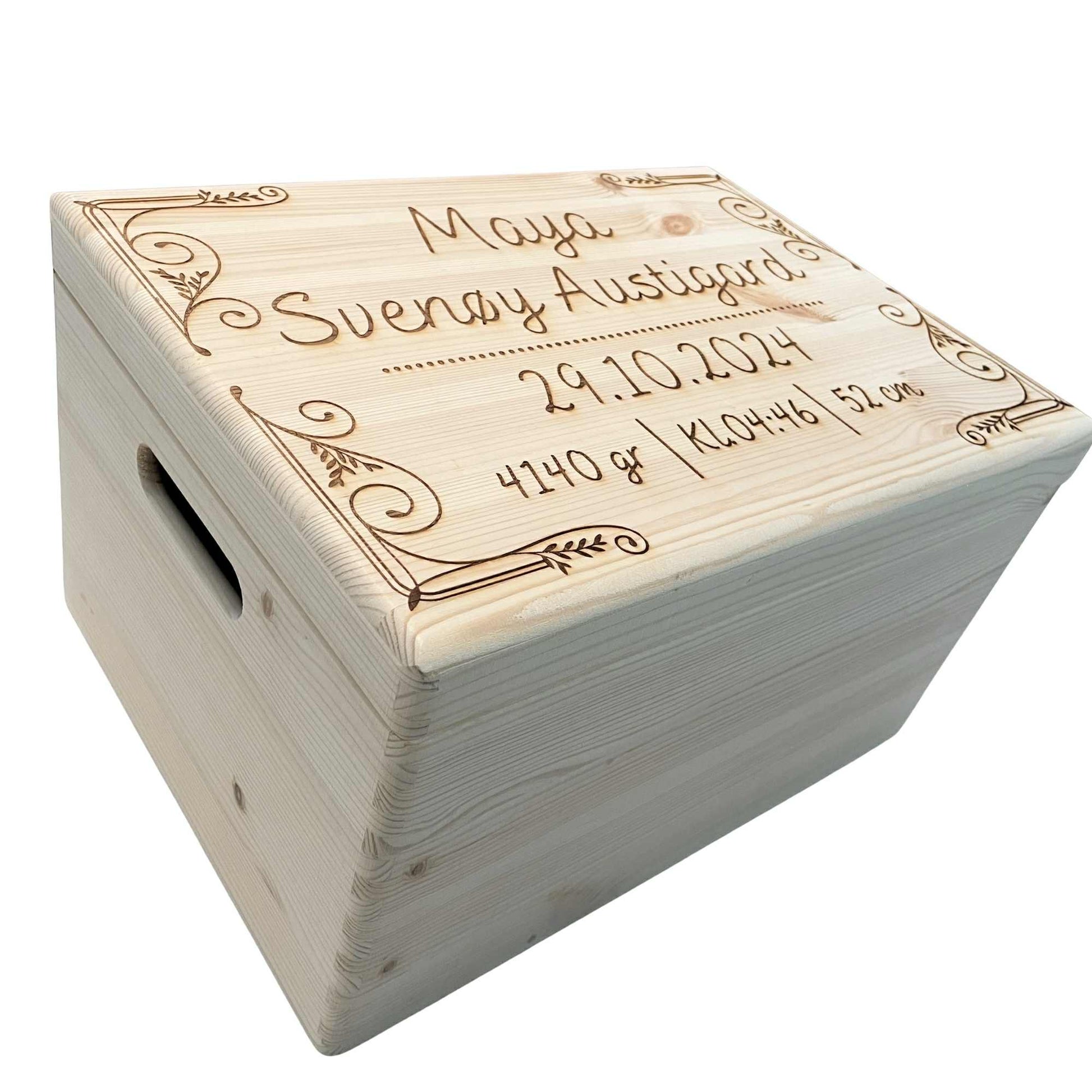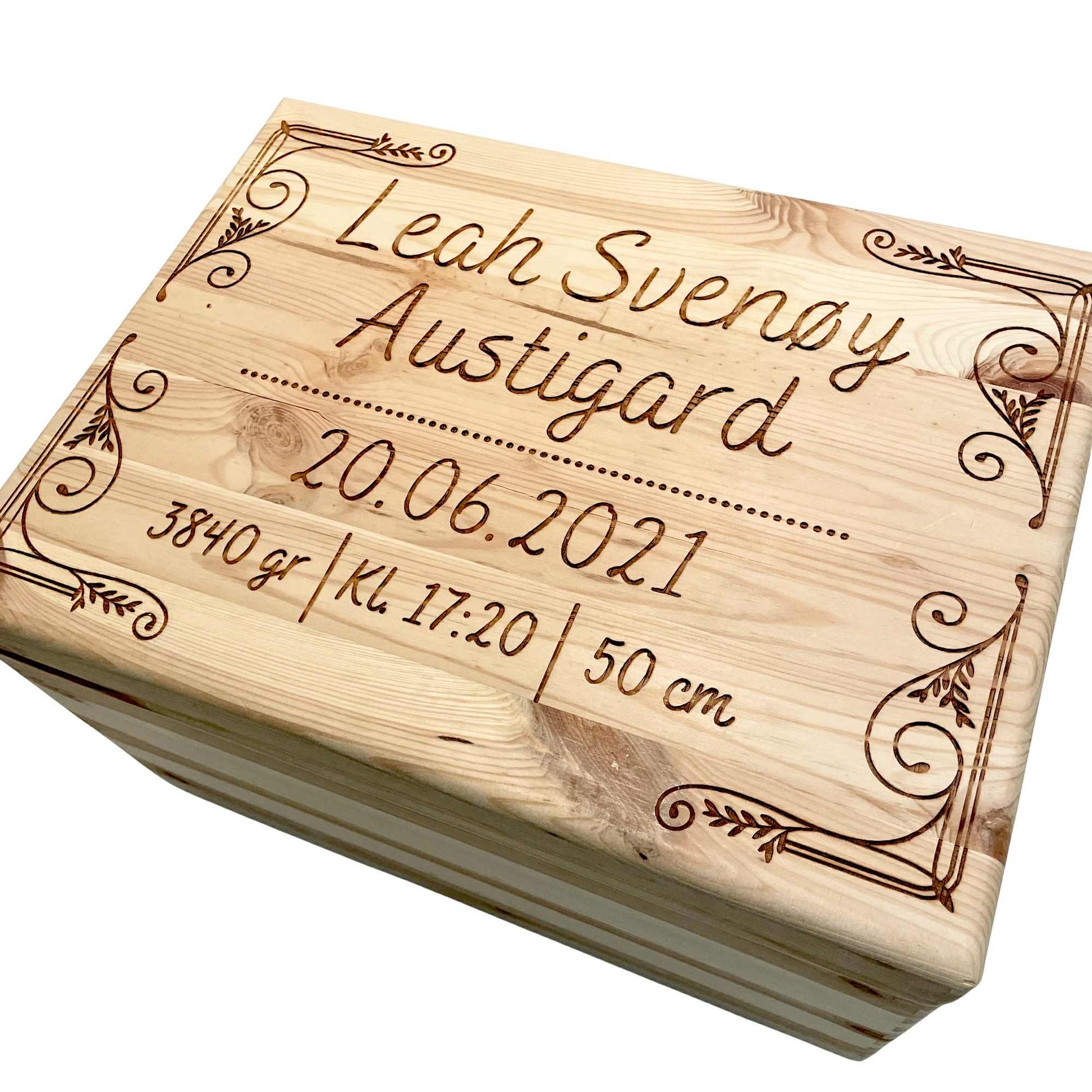 En vakker minnekiste i tre, perfekt for å samle og ta vare på de små og store øyeblikkene fra barndommen – som fødsel, dåp, bursdager og andre minner du vil bevare.