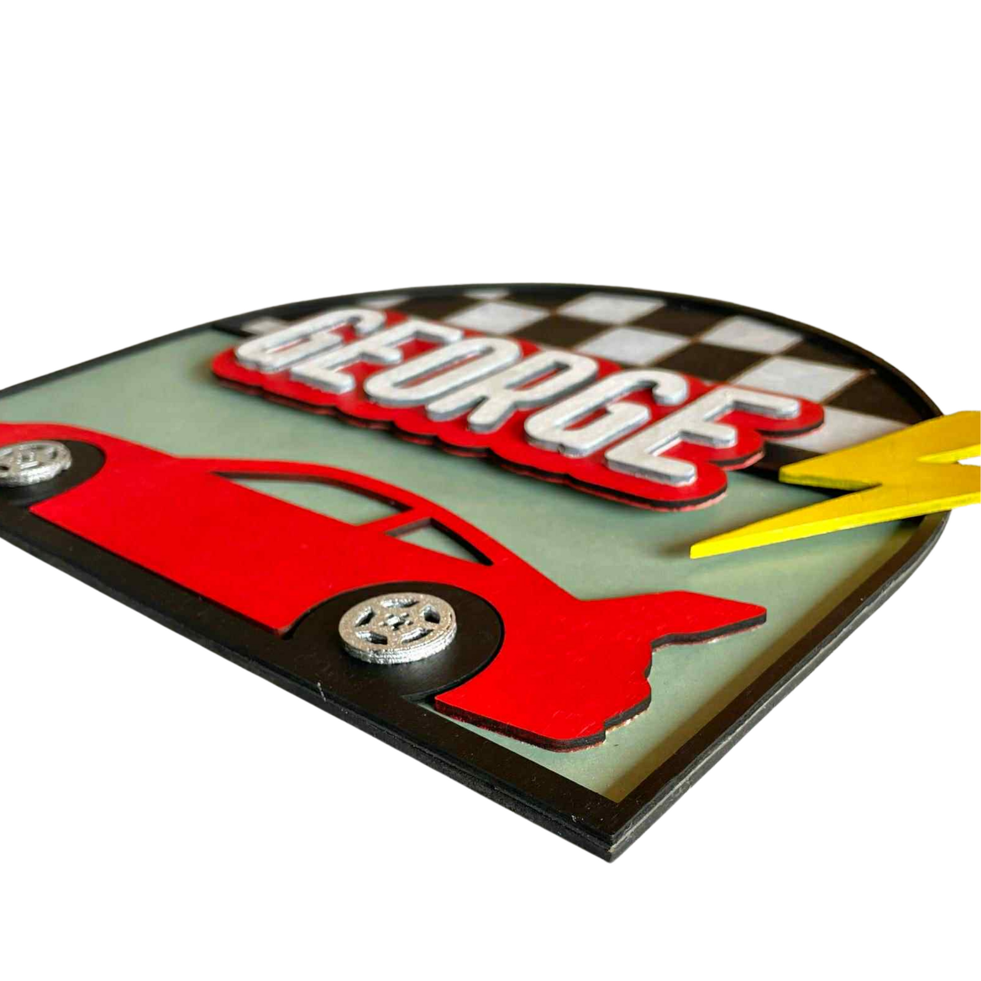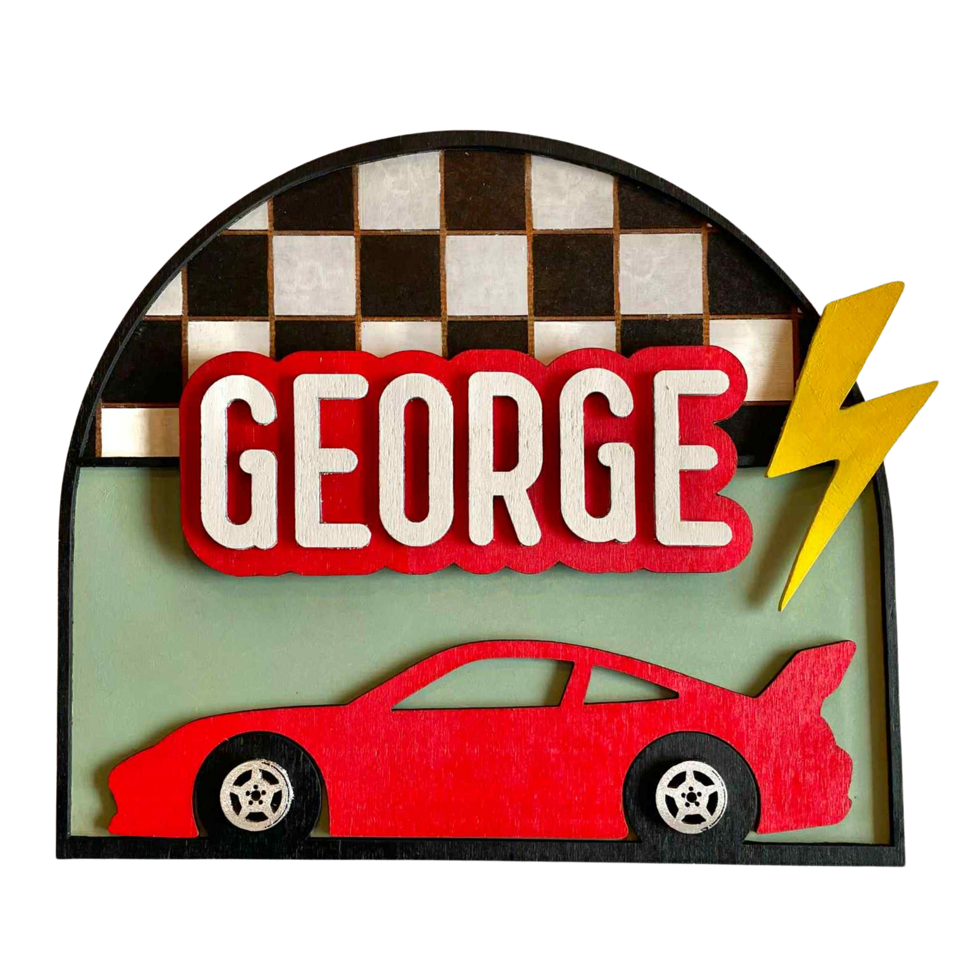 Gi rommet et personlig preg med dette håndlagde skiltet, designet med navn, bil og sterke farger! Skiltet er laget med lasergravering, bygd opp i flere lag kryssfiner og malt for hånd, og passer perfekt til barnerom, bursdagsgaver eller dekor til bilinteresserte.