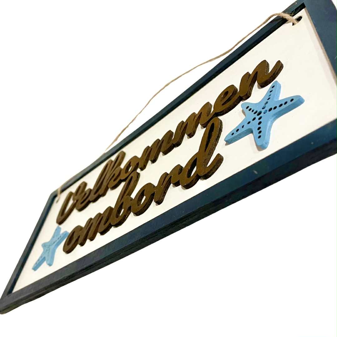 Et koselig og maritimt skilt som ønsker gjestene velkommen med sjøens sjarm. Skiltet har mørk blå ramme og hvit bakgrunn, med teksten «Velkommen ombord» i brun, svingende skrift. To blå sjøstjerner pryder hver side av teksten, og skiltet henges enkelt opp med snor.