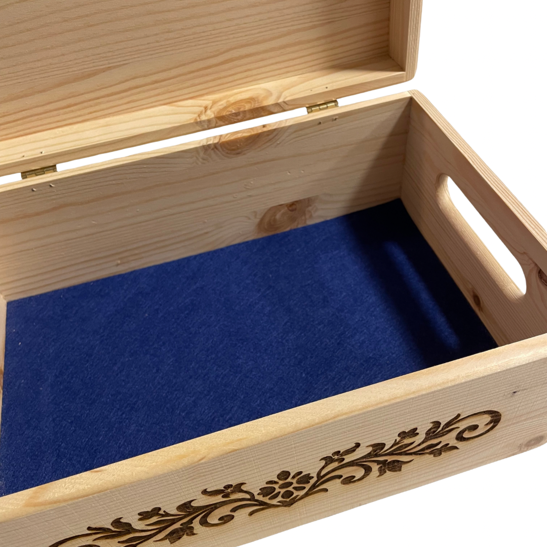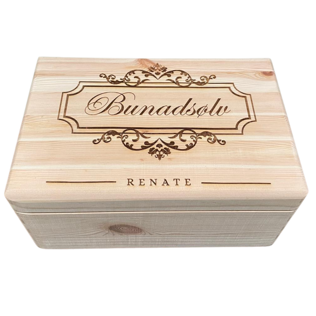 Gi bunadsølvet ditt et vakkert og varig hjem! Dette treskrinet er laget i furu og gravert av Montec Design med valgfritt navn på lokket. Perfekt som gave til konfirmasjon, bryllup, dåp eller til deg selv.