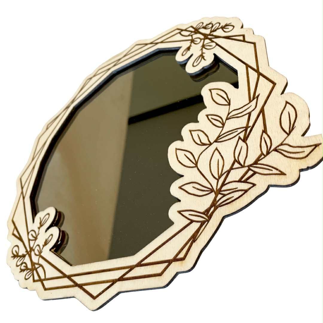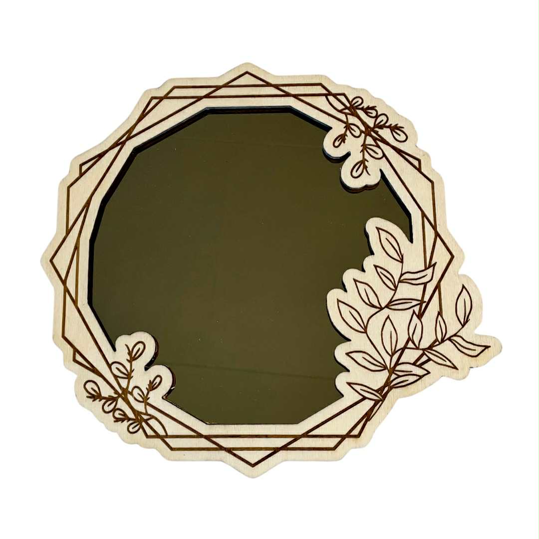 Et stilrent og dekorativt speil med åttekantet form, omgitt av lasergravert geometrisk mønster og detaljerte blader og grener som strekker seg fra hjørnene. Laget i kryssfiner og måler 24 x 26 cm – en vakker kombinasjon av natur og struktur.